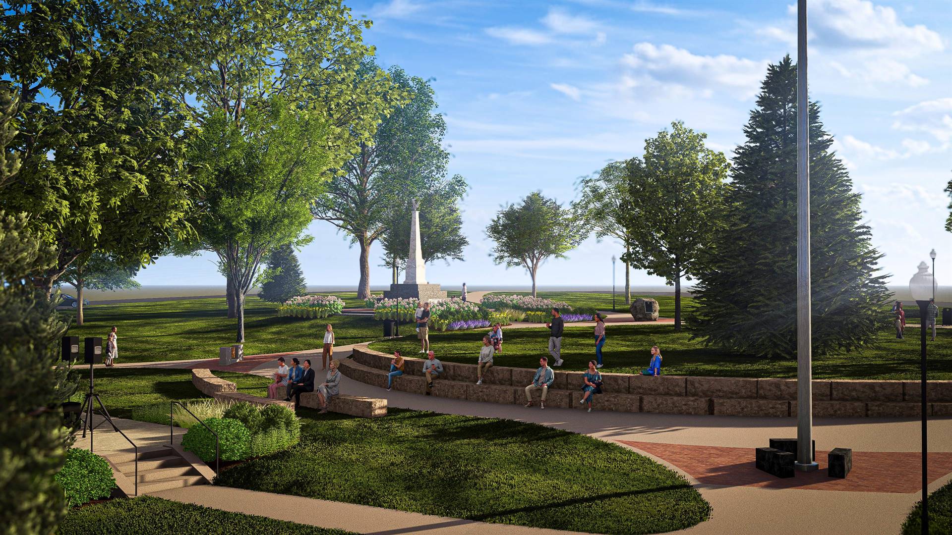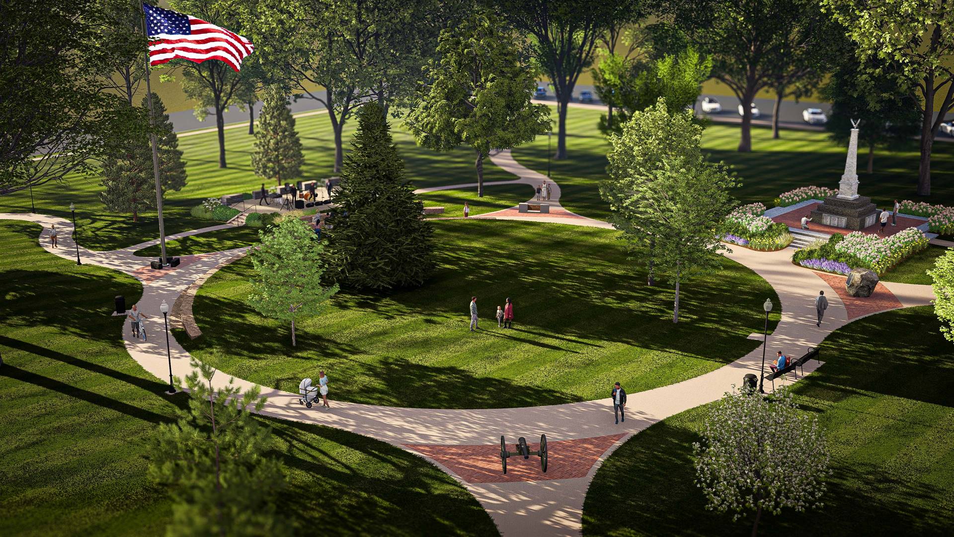 OHM Advisors of Columbus designed the new layout of the square with several factors in mind. One was accessibility to the memorials, which will be approachable through paved walkways that lead to a circular central lawn that faces the stage.